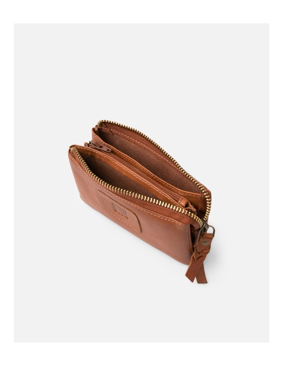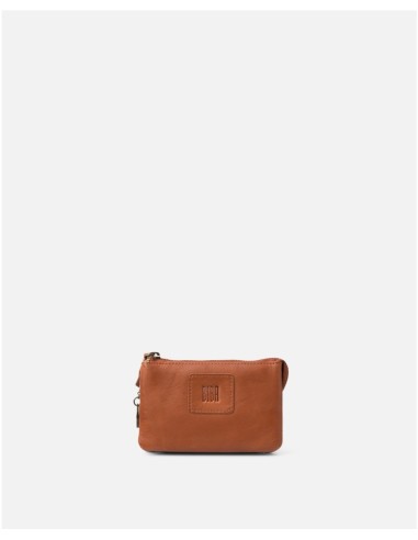 Estuche de piel vacuna lavada. Cierre con cremallera. Compartimientos para tarjetas y monedas. Llavero interno.