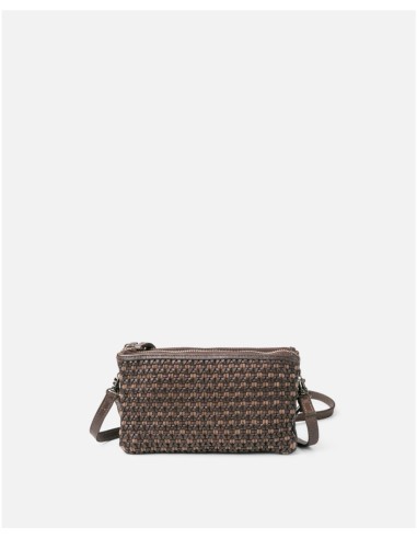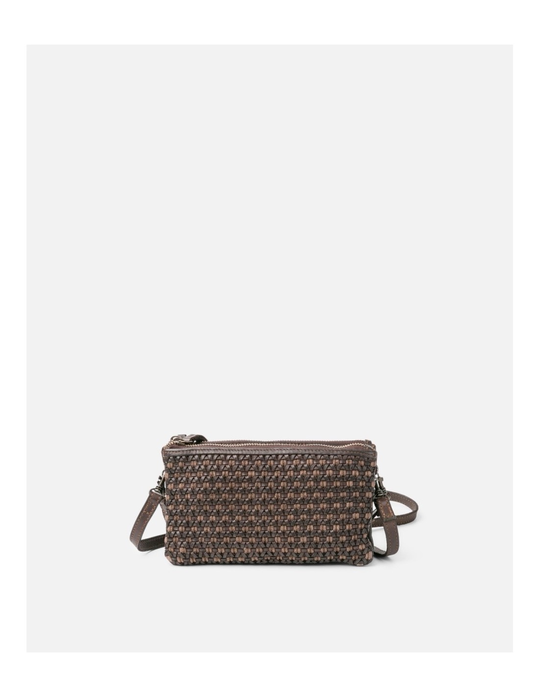 Mini bolso bandolera de piel vacuna lavada y trenzada con hilo grueso. Tres compartimientos, de los cuales dos cierran con cremallera. Asa de hombro pequeña y extraible, bandolera regulable y extraíble, bolsillos externos e internos, y forro de algodón.
