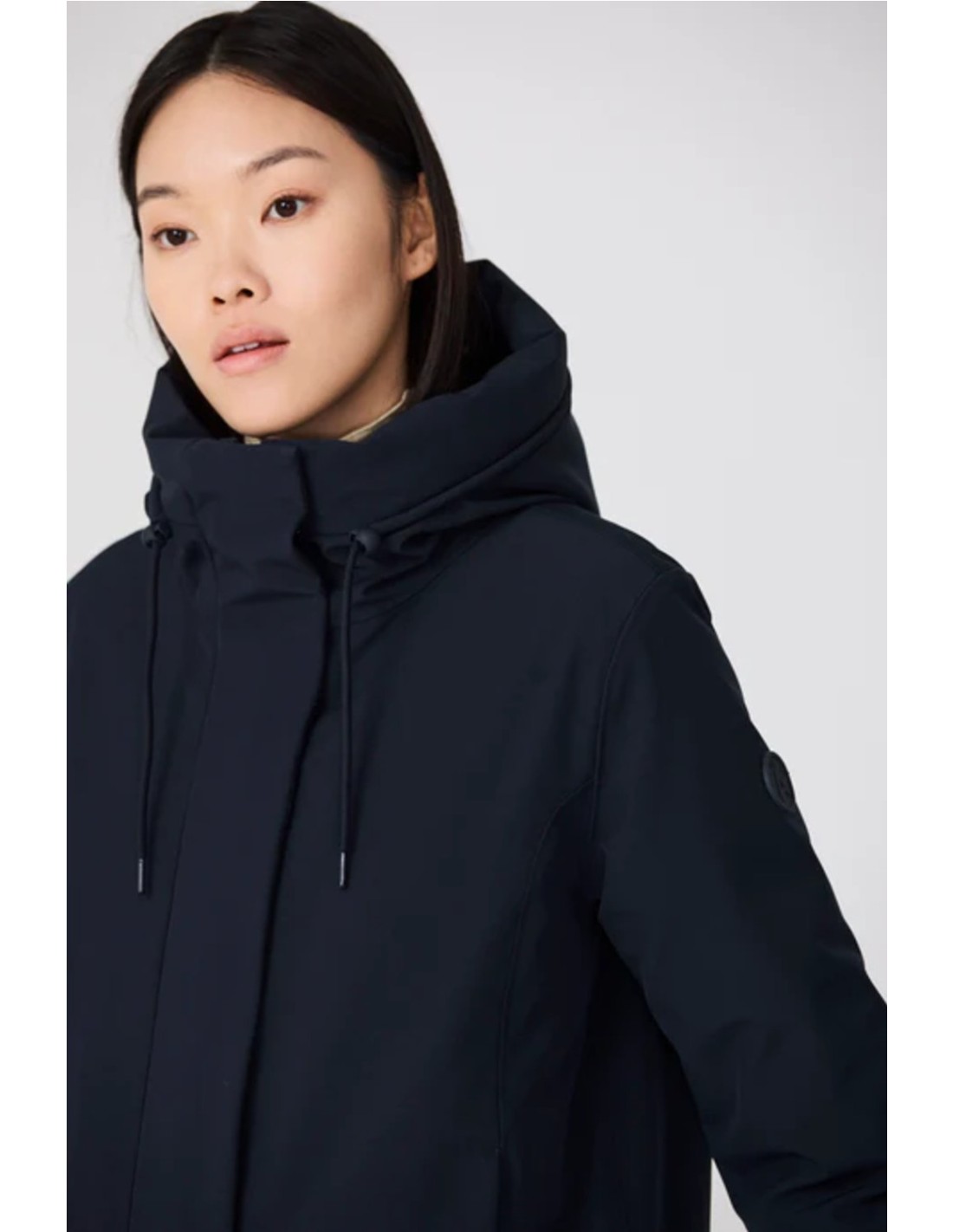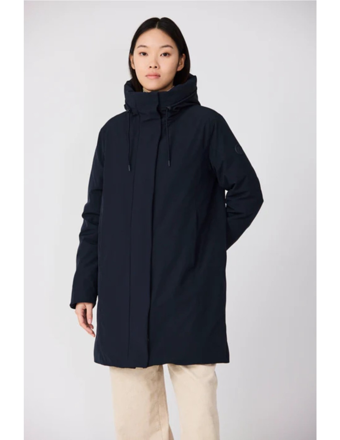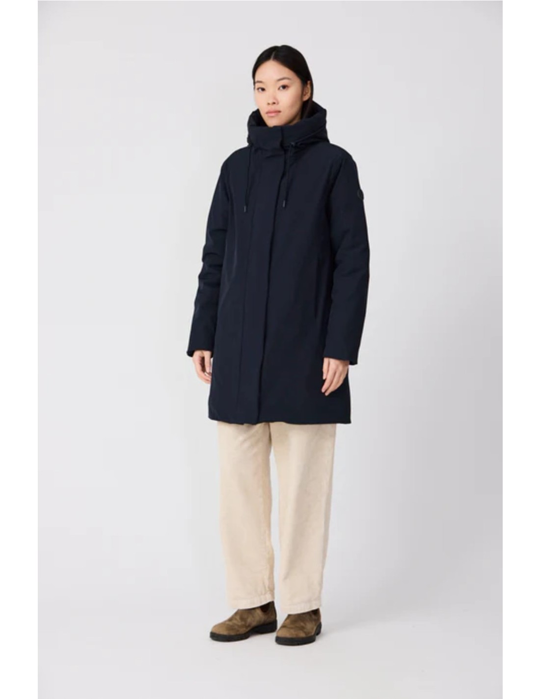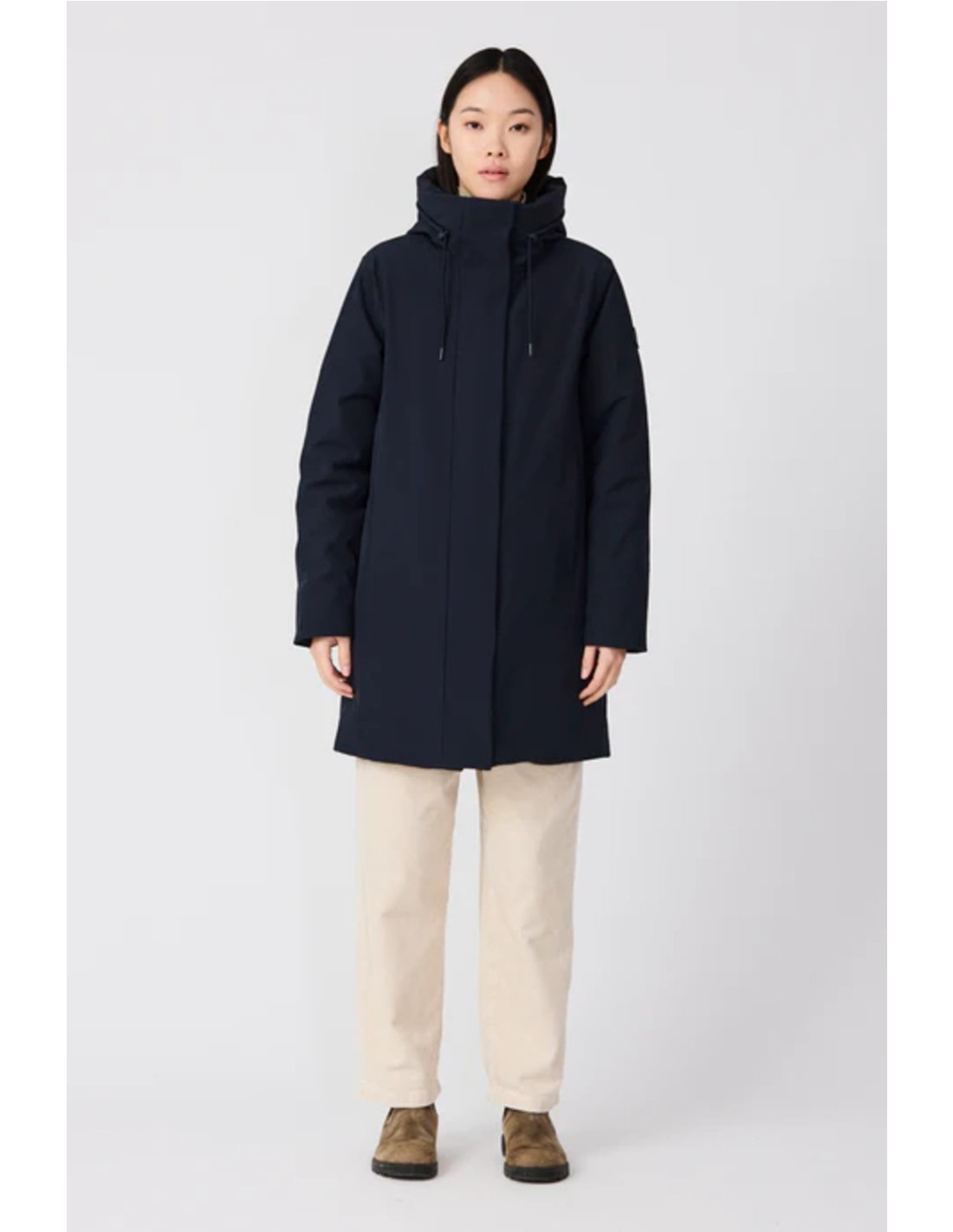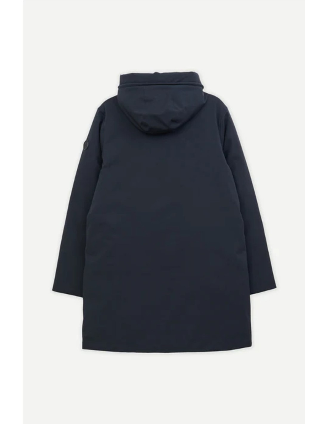 Capa exterior: 91% poliéster, 9% spandex con acabado repelente al agua duradero (DWR). Aislamiento: Fibras entrelazadas de poliéster (alternativa sin plumas). Forro interior: 100% nylon. 100% impermeable (columna de agua 5000 mm). Costuras completamente selladas; toda la prenda cosida con hilos impermeables. Cremallera frontal doble cursor de nylon con solapa oculta de cierre magnético. Bolsillos en costura con cremalleras impermeables ocultas; forro de bolsillos en tejido polar;