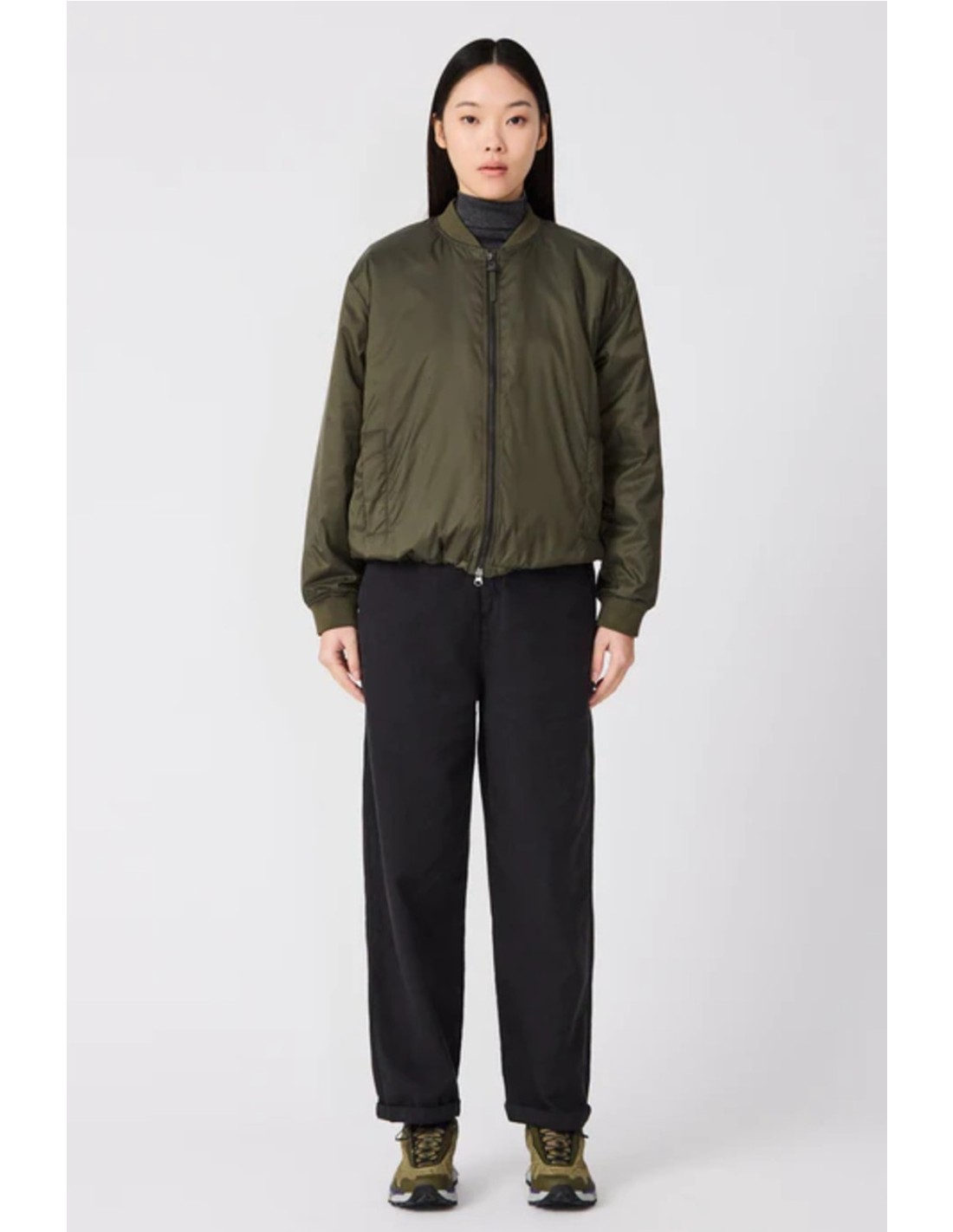 Estilo bomber con canalé en puños y cuello.