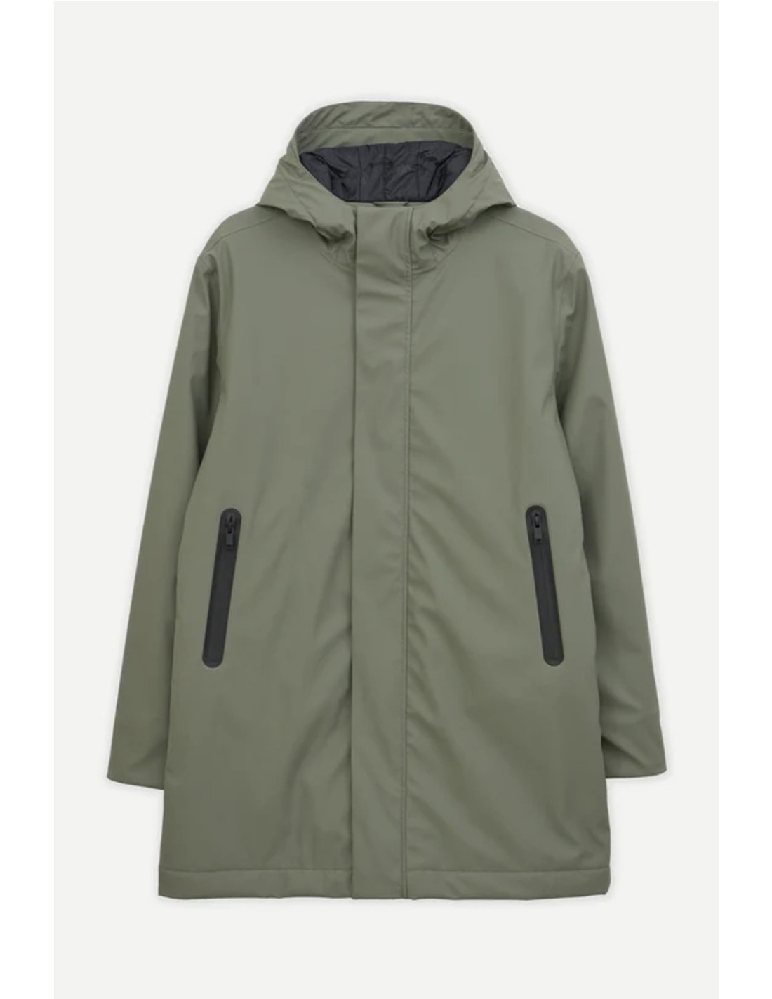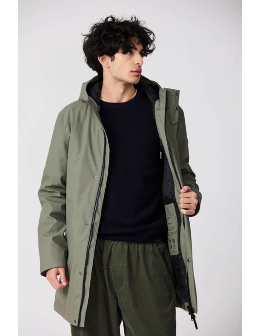 Gran cremallera frontal de resina con doble cursor y botones a presión ocultos.