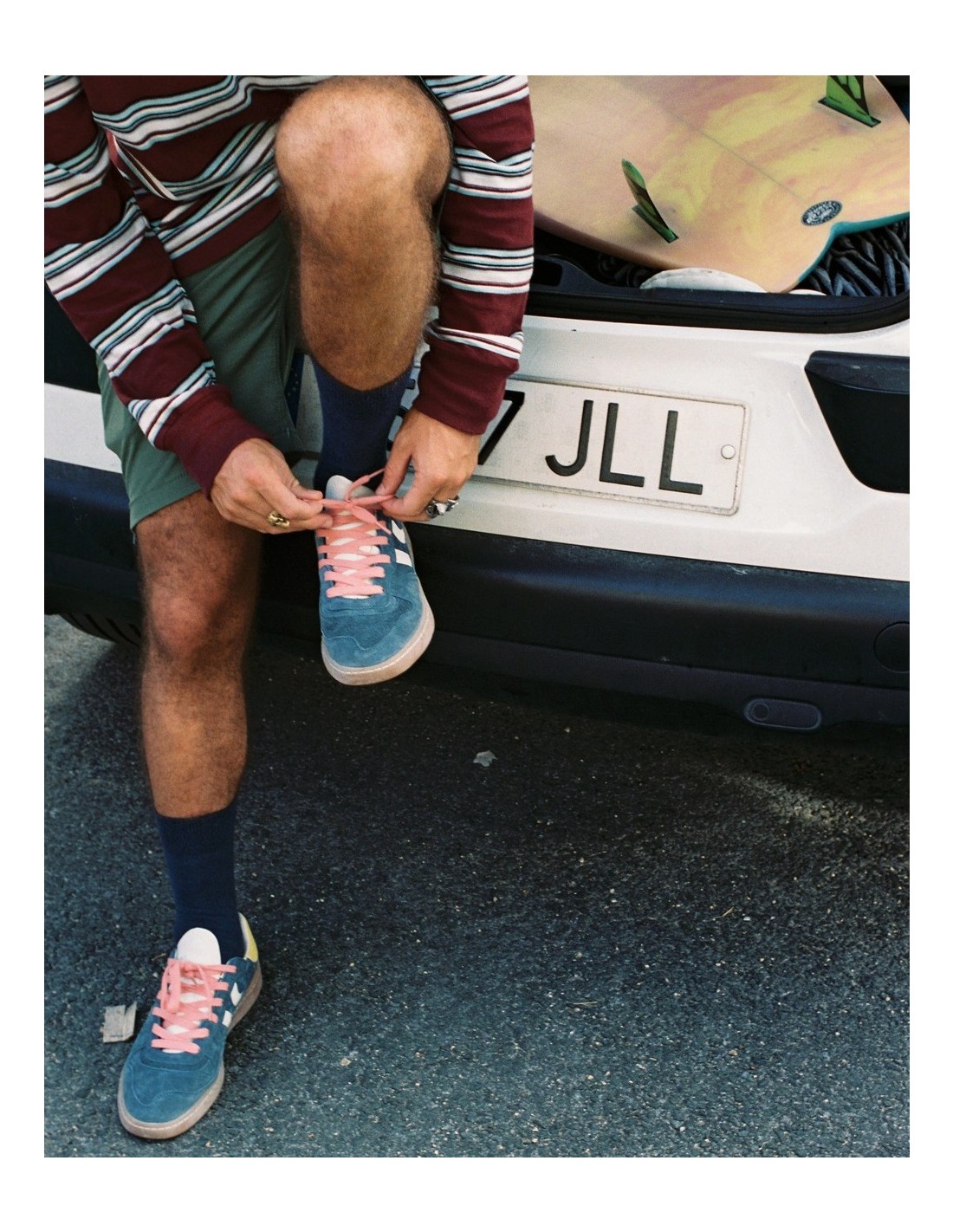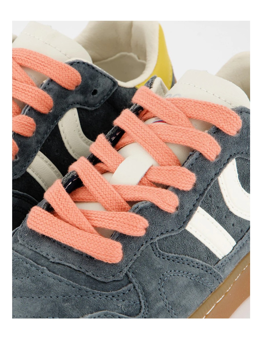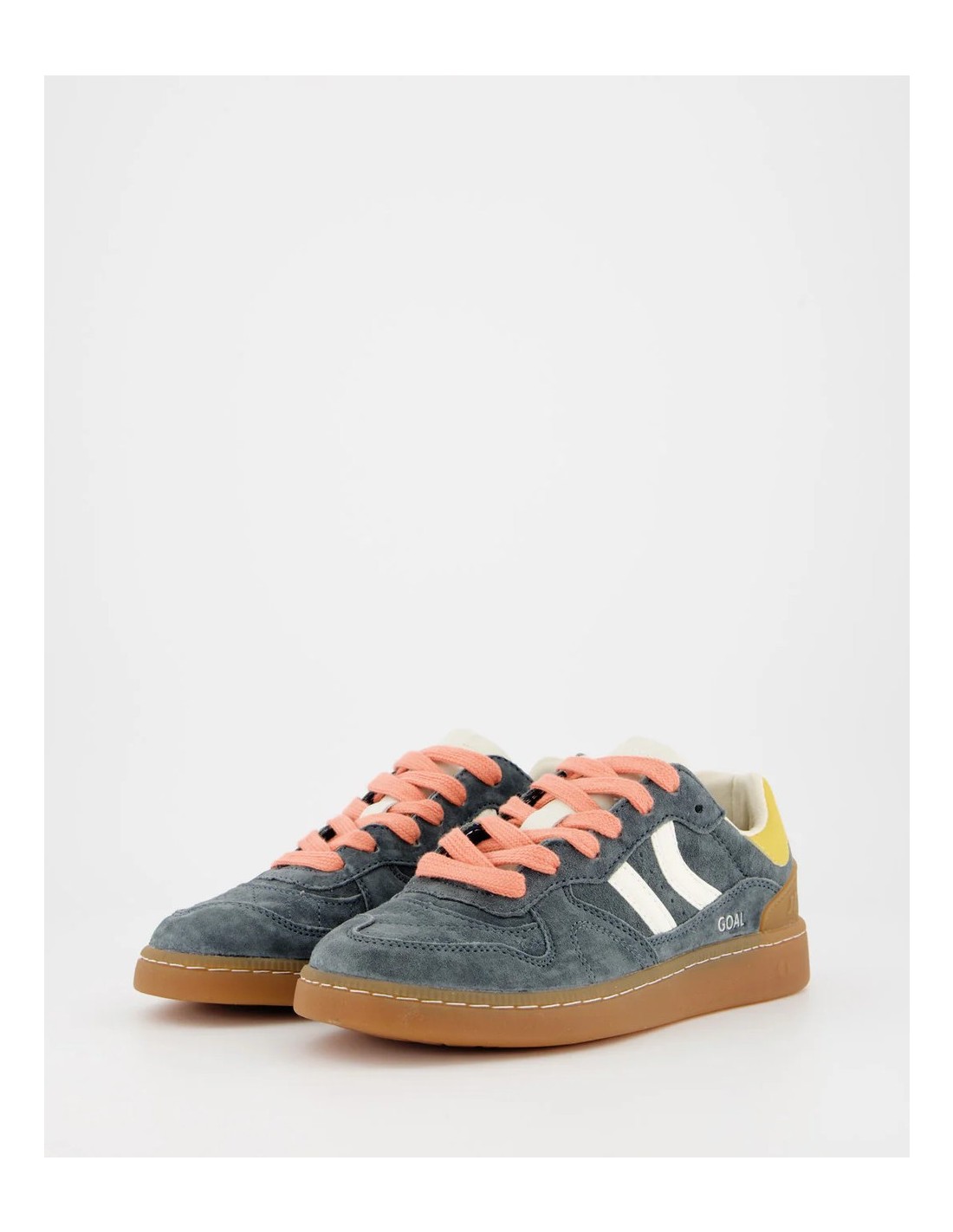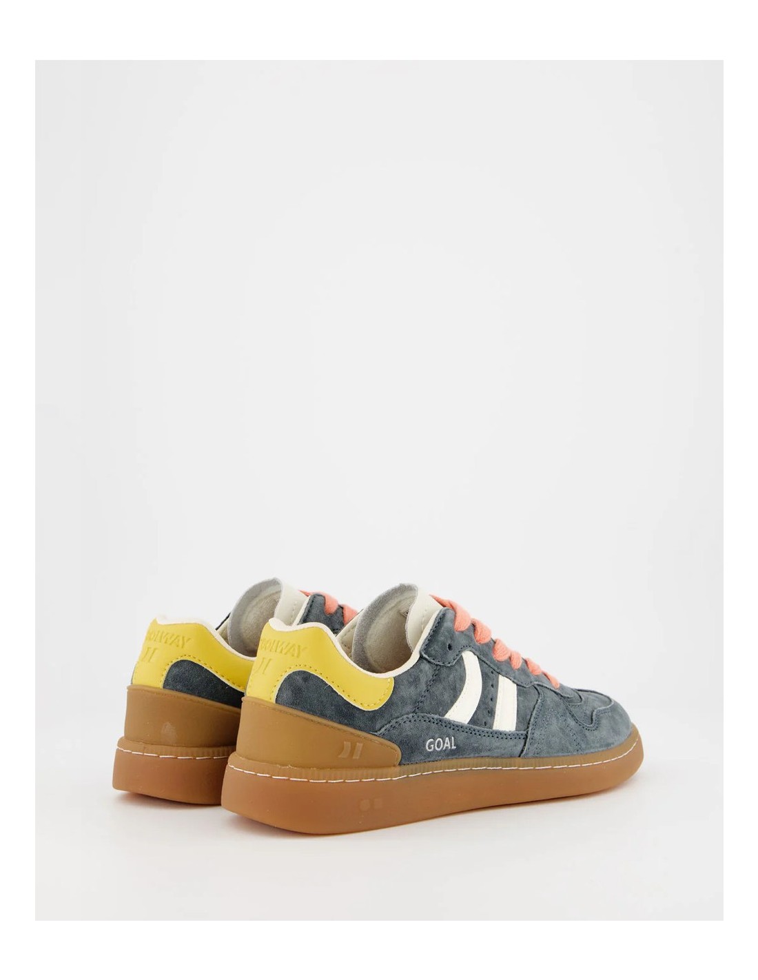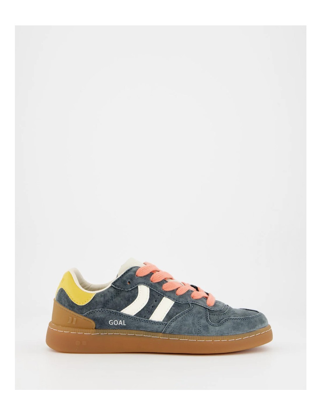 Zapatilla deportiva de serraje con detalles en contraste de color. Lengüeta de piel y preformada con un acolchado figurado. Vistas del forro en piel. Cordones planos de algodón en dos tonos intercambiables. Cuello ligeramente acolchado. La parte delantera lleva un refuerzo de pespuntes. Suela flexible de goma/caucho que aporta durabilidad y agarre. Cuenta con el nombre del modelo “GOAL” en lateral en oro viejo.