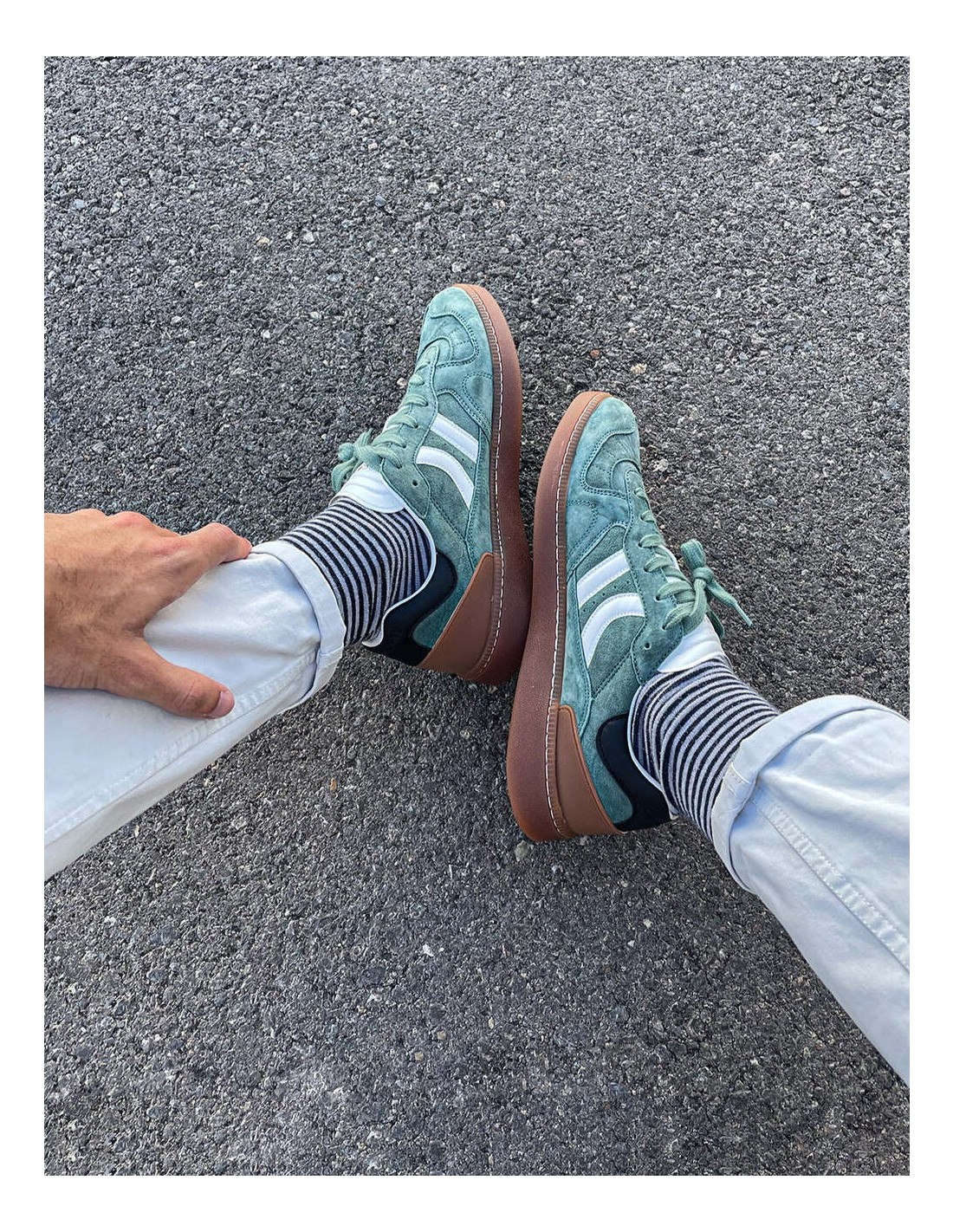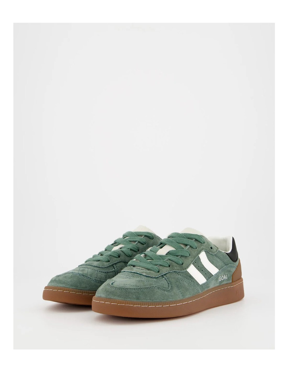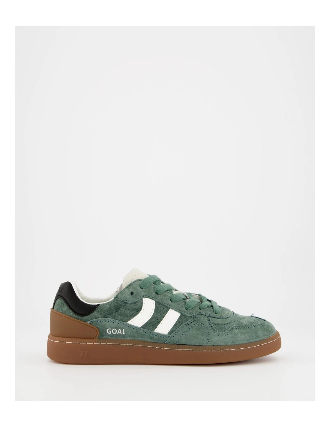 Zapatilla deportiva de serraje con detalles en contraste de color. Lengüeta de piel y preformada con un acolchado figurado. Vistas del forro en piel. Cordones planos de algodón en dos tonos intercambiables. Cuello ligeramente acolchado. La parte delantera lleva un refuerzo de pespuntes. Suela flexible de goma/caucho que aporta durabilidad y agarre. Cuenta con el nombre del modelo “GOAL” en lateral en oro viejo.